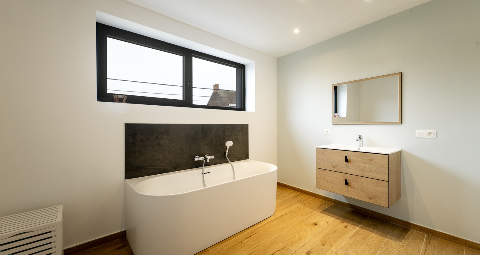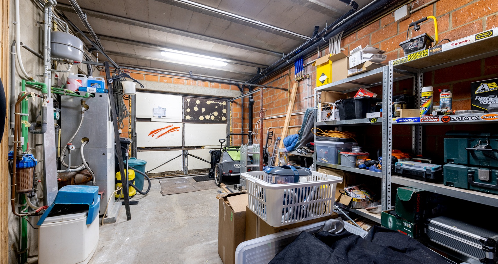 Niveau rez-de-chaussée: un hall d’entrée, une cuisine, une salle à manger, un vaste salon donnant accès à la terrasse et au jardin, possibilité de créer un coin jeux/bibliothèque, un couloir, un débarras, une salle de douche, un wc/buanderie, un rangement avec accès vers l’extérieur, et un garage.
